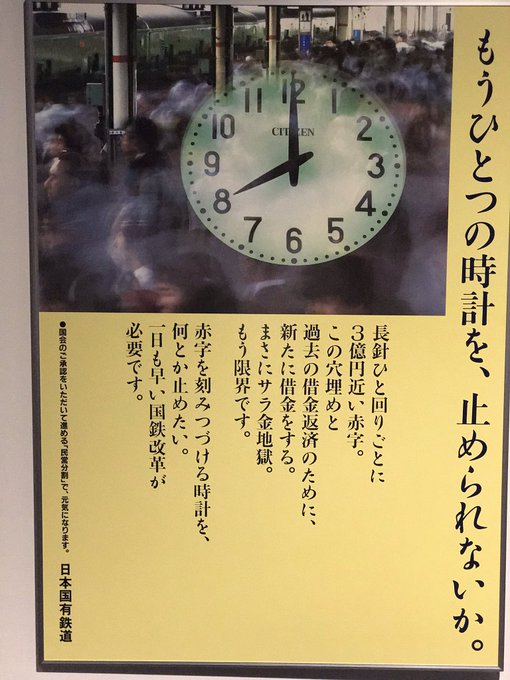 こんな自虐的なすごいポスターも貼られていた。国鉄改革で。けど今日本国政府がこの状況。長針回すたびに1000億円ぐらい20年度予算で増えたんじゃないかな pic.twitter.com/m4Zj53P0um
